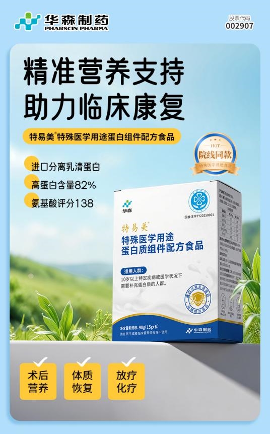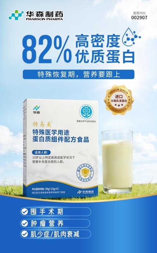 华森制药特易美特殊医学用途蛋白质组件配方食品,专为10岁以上特定疾病或医学状况下需要补充蛋白质的人群设计,如术后康复、肿瘤、烧伤、创伤、消化吸收障碍等需要高质量蛋白质支持的患者。其配方科学合理,蛋白质含量高达82%,氨基酸评分138,支链氨基酸占比高